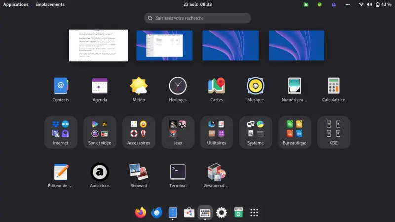 Côté utilisation, j’aime la philosophie tout au clavier du couple Debian/GNOME. Une pression sur la touche Windows et c’est parti. Il m’arrive encore d’installer quelques extensions comme Apps Menu ou Dash to dock, de vieilles habitudes de mon époque Mac OS dont je pense me passer à l’avenir.